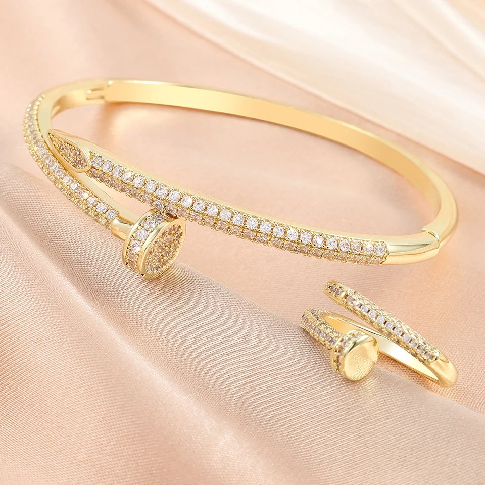 Yupsk 2 قطعة لامعة AAA الزركون مسمار سوار خاتم مجموعة للنساء الفاخرة الشظية الذهب اللون المشاركة حفل زفاف مجوهرات