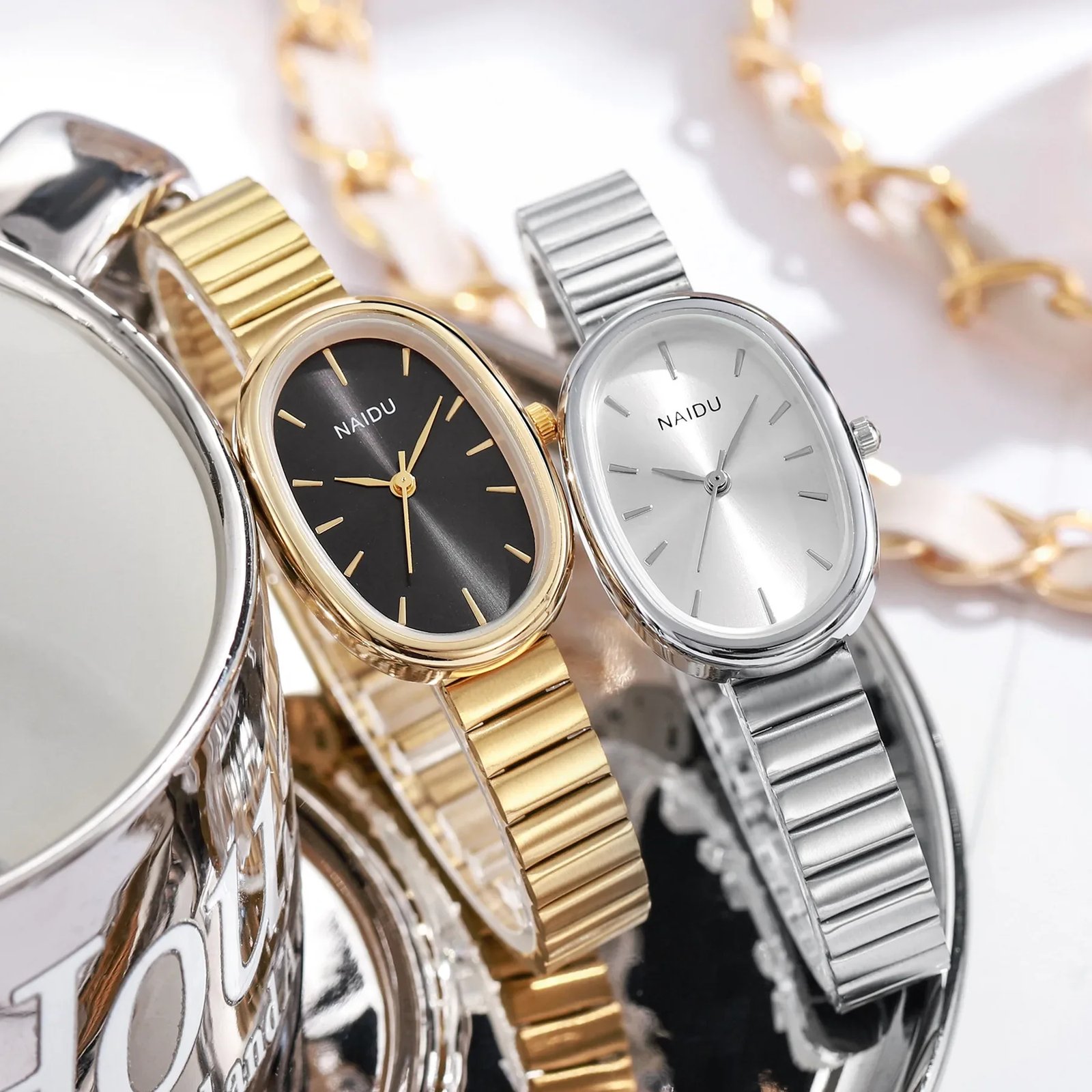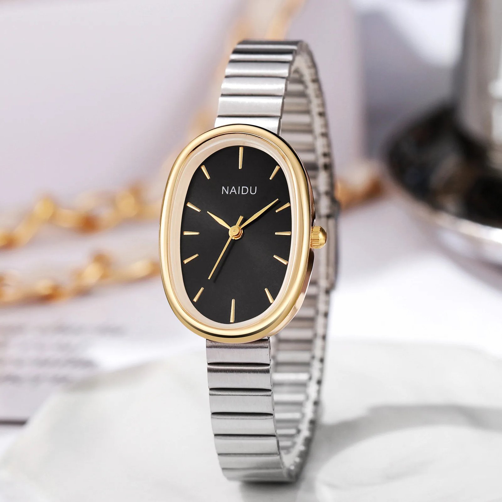 • حزام الساعات البيضاوي يمنحك مظهرًا أنيقًا وأنثويًا بفضل تصميمه البيضاوي الفريد والحزام الرقيق الذي يضيف لمسة خفيفة ومميزة