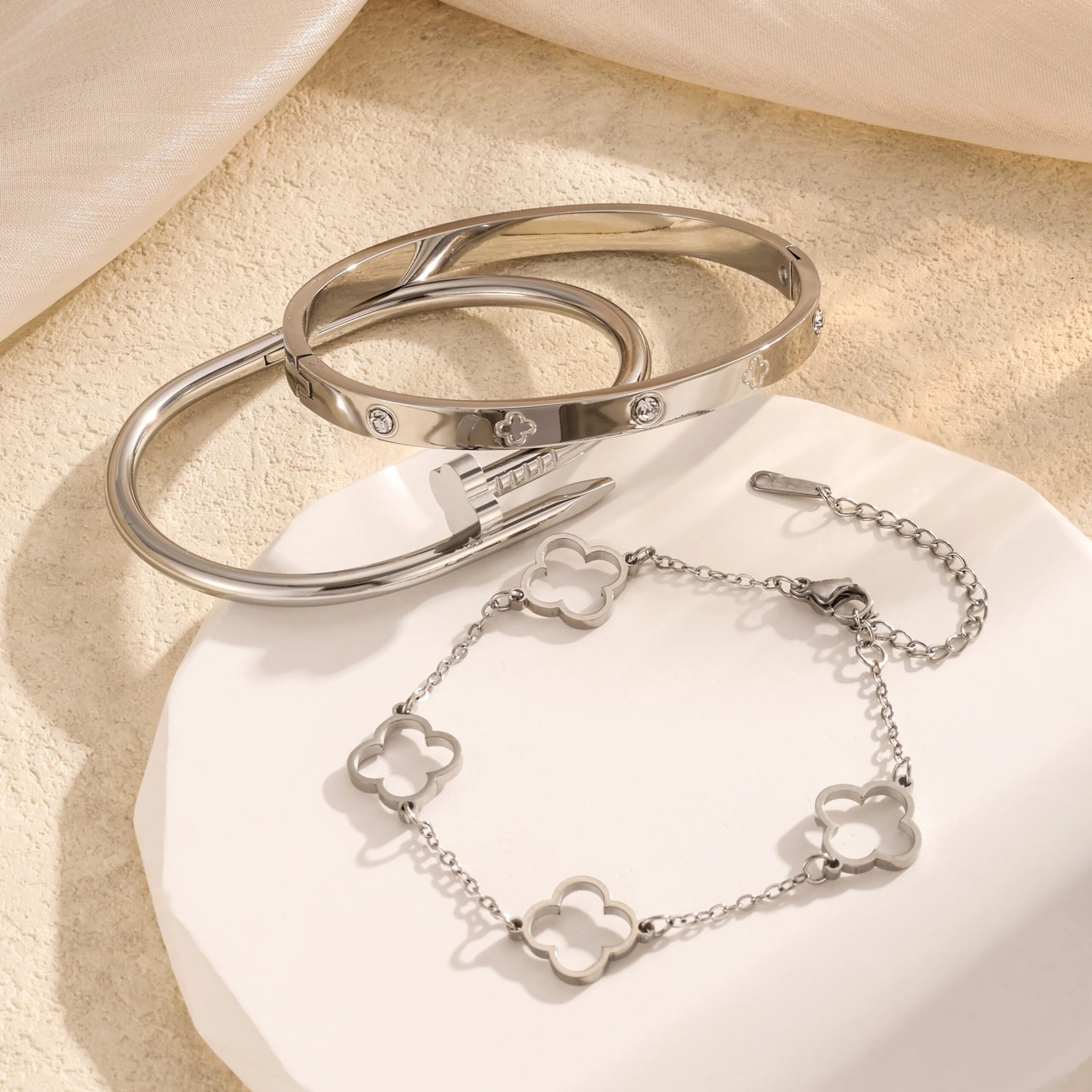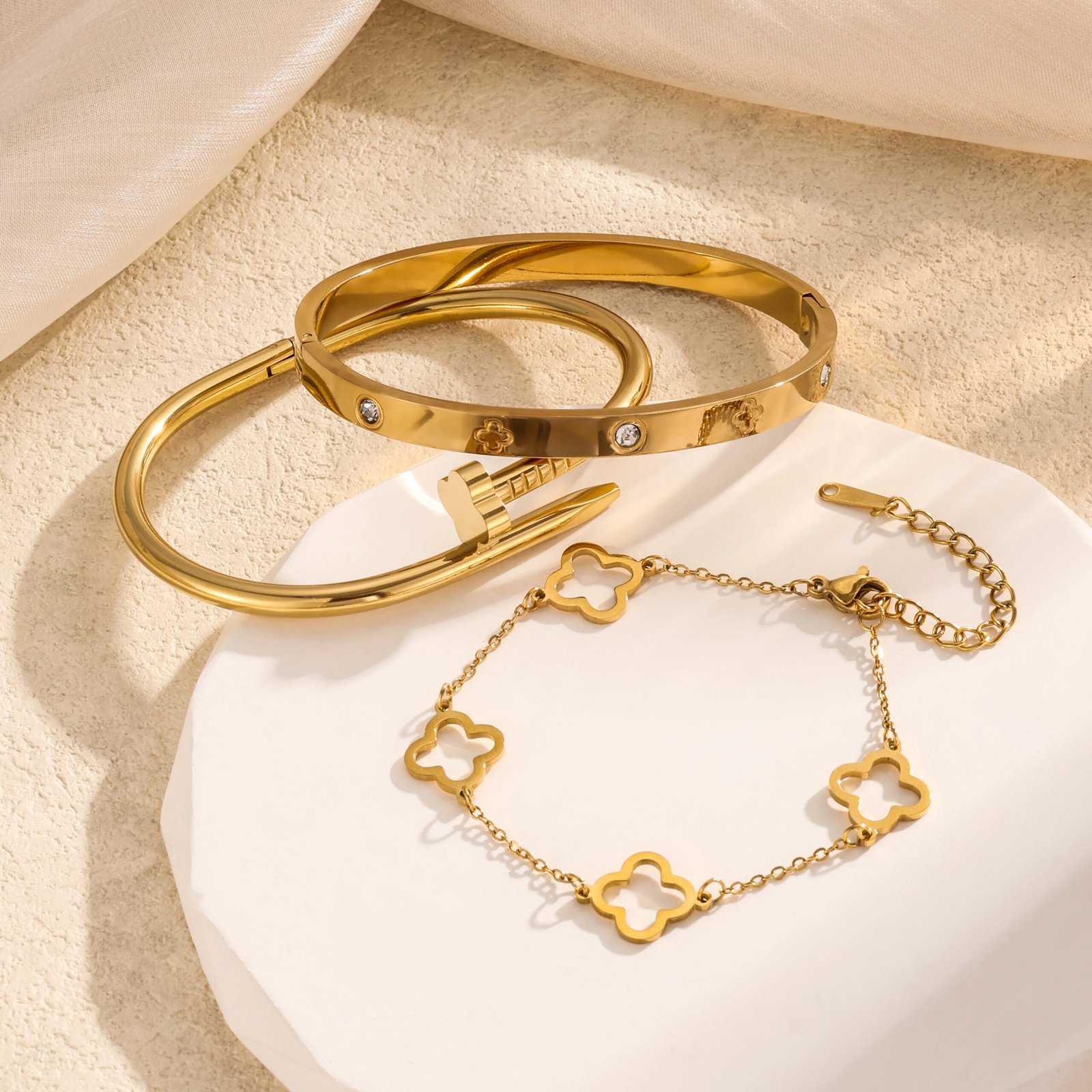 Htpwe الفولاذ المقاوم للصدأ أربع أوراق البرسيم مسمار مجموعة سوار المرأة مطلي 18 كيلو الذهب زوجين هدية عيد سوار طابور المجوهرات اليومية
