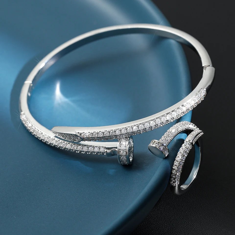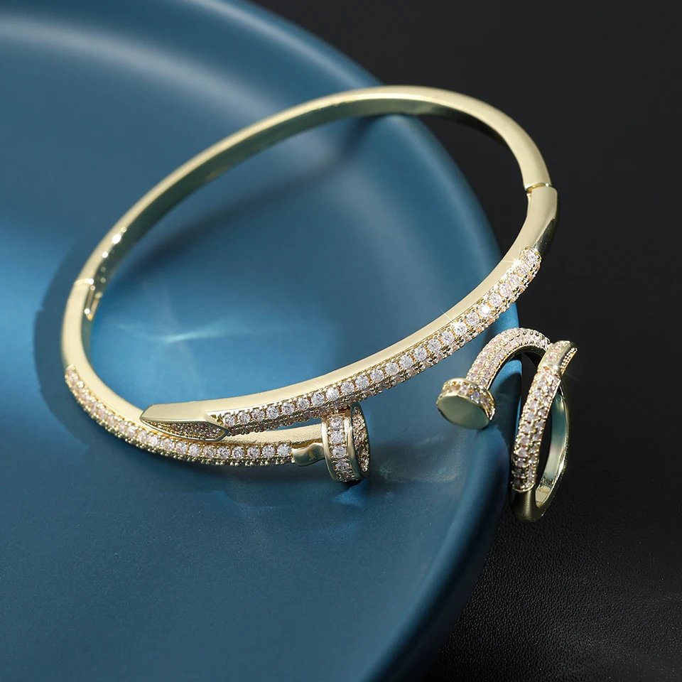 Yupsk 2 قطعة لامعة AAA الزركون مسمار سوار خاتم مجموعة للنساء الفاخرة الشظية الذهب اللون المشاركة حفل زفاف مجوهرات