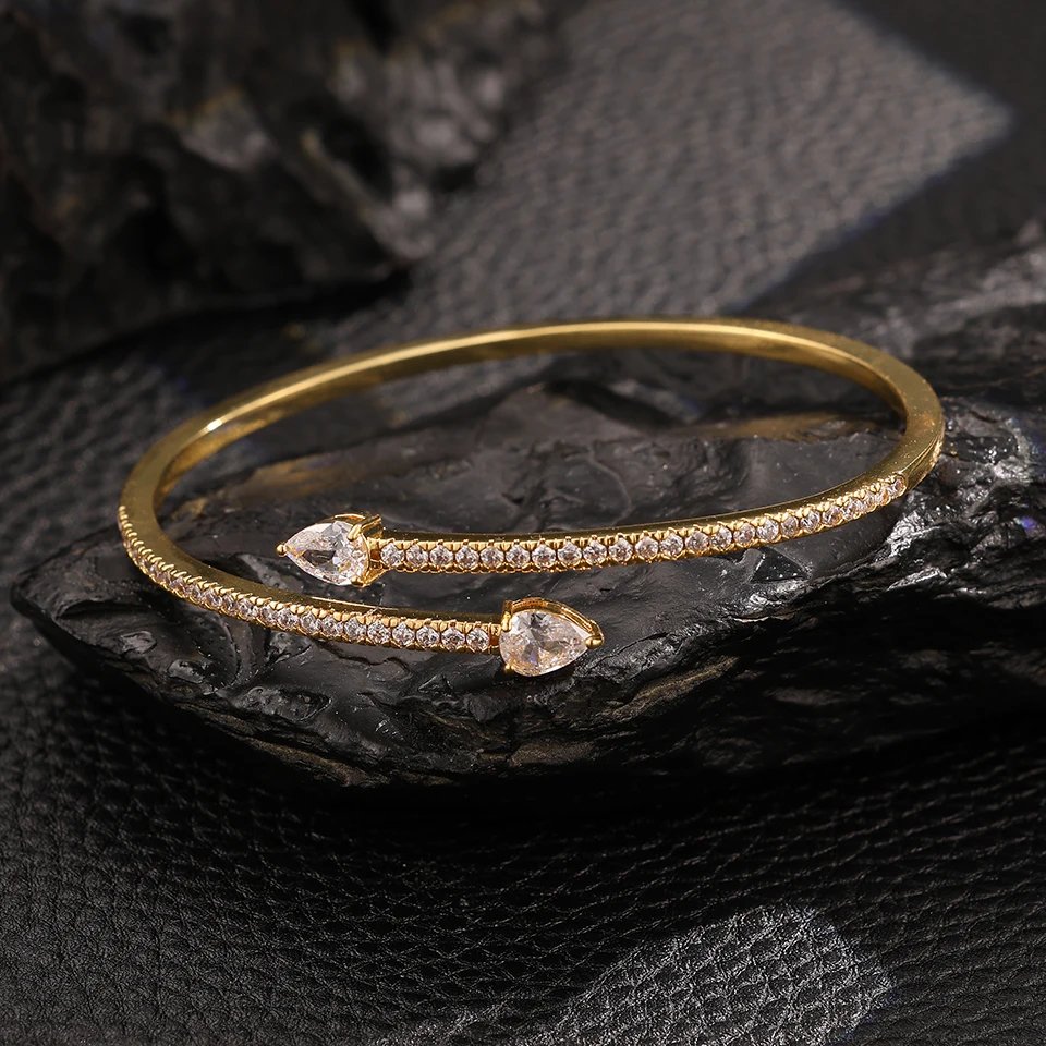 سوار ZAKOL كلاسيكي مفتوح للنساء بتصميم قطرتي ماء أنيق مع كريستالات زركون كاملة اللمعان، مثالي لحفلات الزفاف والمناسبات الرسمية لإطلالة راقية وفاخرة.
